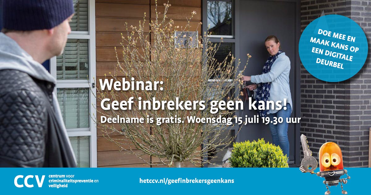 Na weken binnen zitten, gaan we nu massaal de deur weer uit. Niet iedereen gaat op vakantie, maar met het mooie weer gaan we een avondje naar het terras, een dagje naar het strand of een weekendje weg. Ook inbrekers gaan er graag weer op uit. Speciaal voor bewoners organiseert het Centrum voor Criminaliteitspreventie en Veiligheid (CCV) samen met de politie daarom op woensdag 15 juli van 19.30 – 20.30 uur een gratis webinar ‘Geef inbrekers geen kans’ vol met waardevolle tips om een woninginbraak te voorkomen.